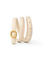 Apportez une touche d’élégance intemporelle à votre tenue avec cette ceinture au design épuré. Elle se distingue par sa finesse et sa boucle dorée aux lignes arrondies, subtilement brillante. Son style minimaliste en fait un accessoire polyvalent, parfait aussi bien pour une tenue habillée que pour un look casual chic.