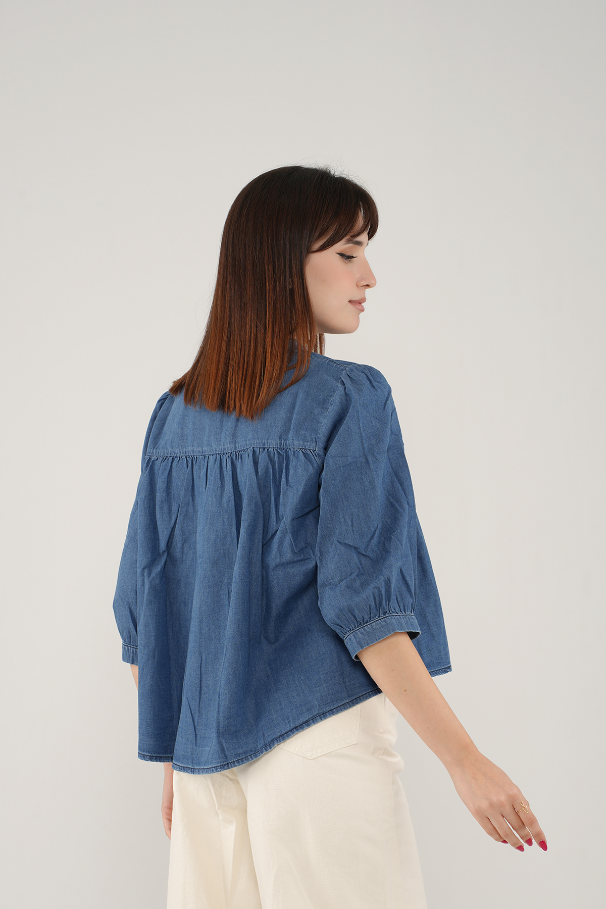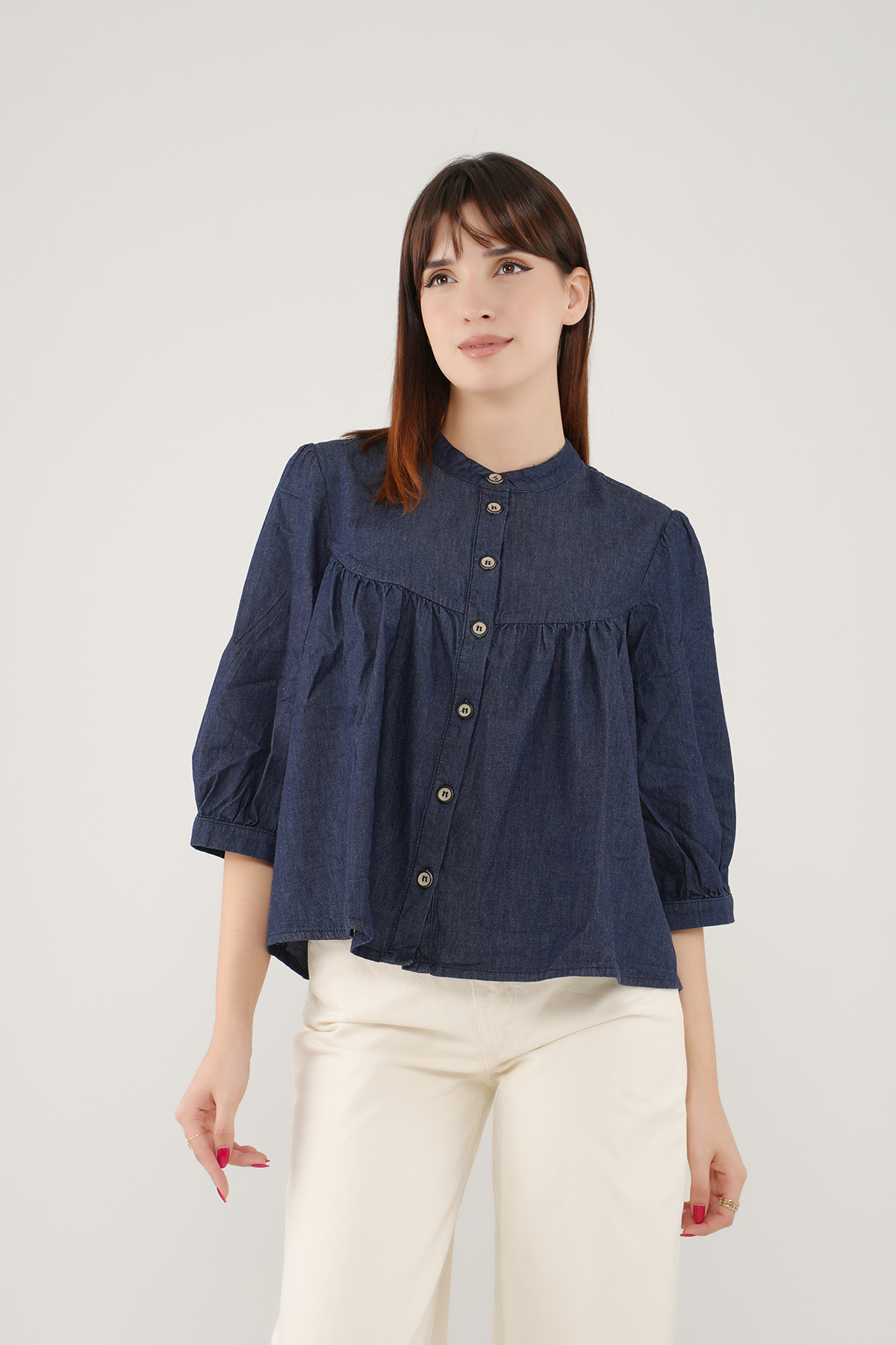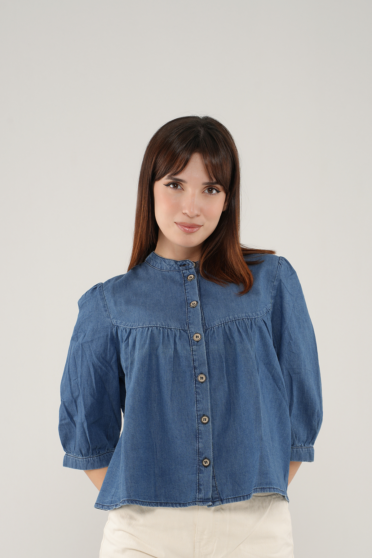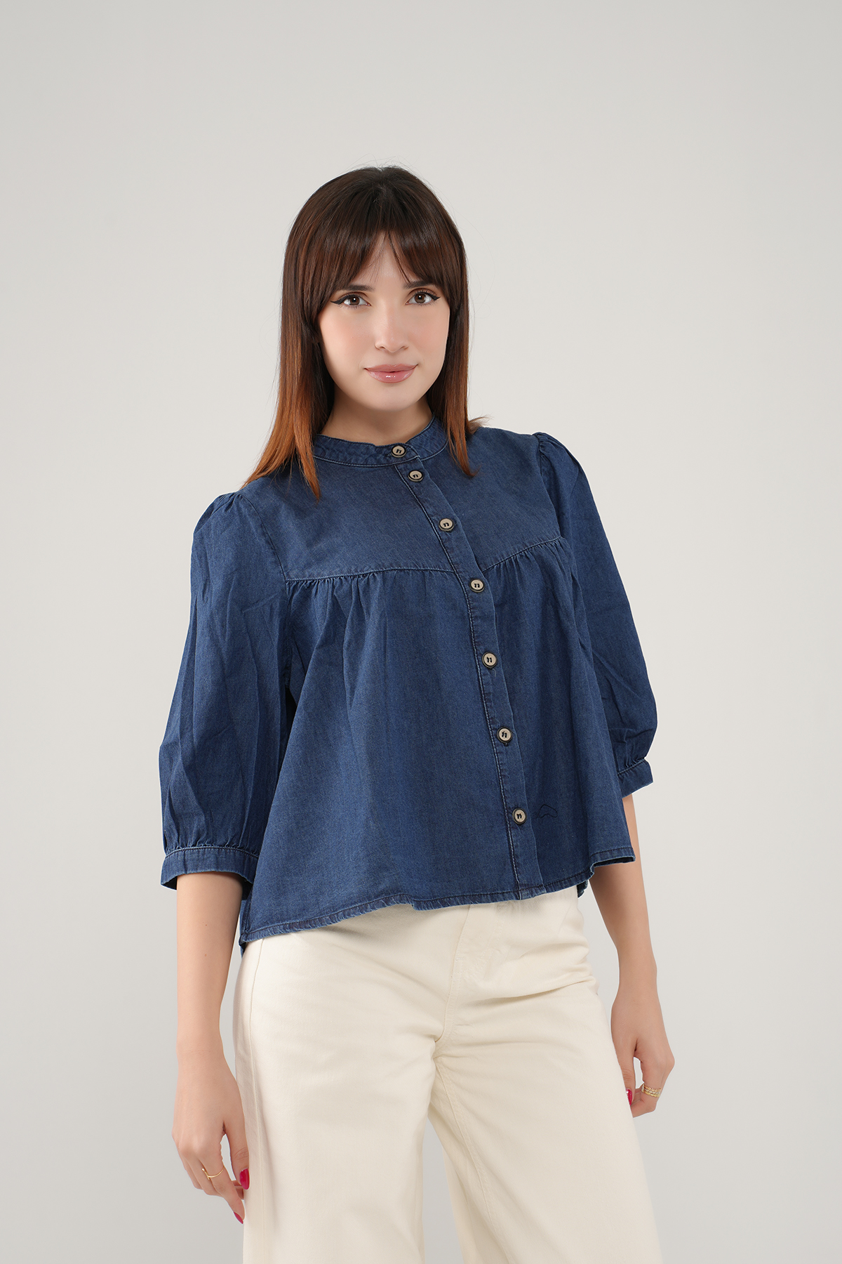 Apportez une touche de féminité et de confort à votre quotidien avec notre Chemise en denim à manches bouffantes.