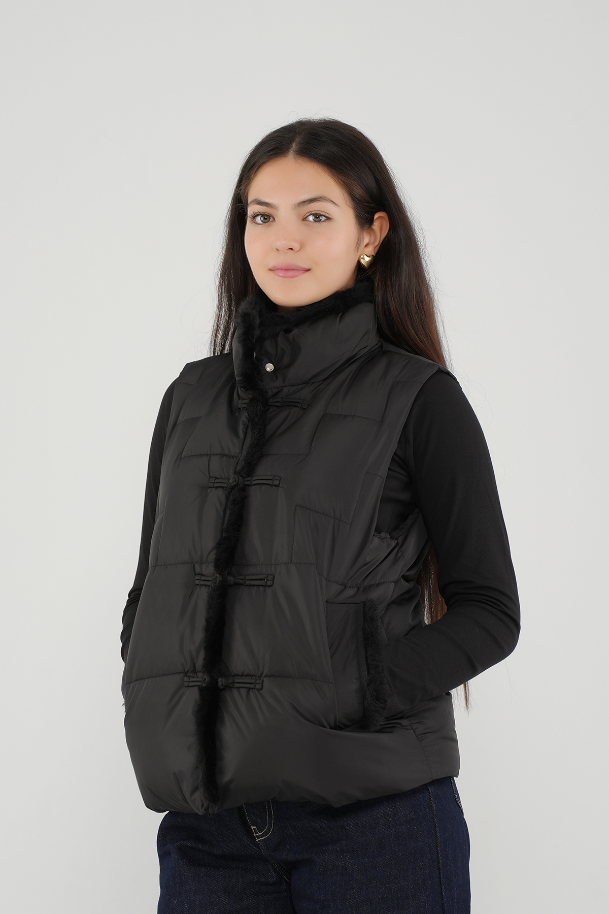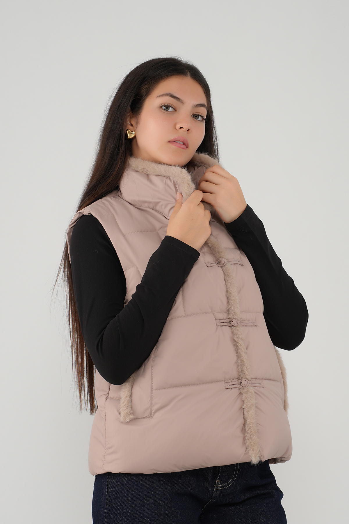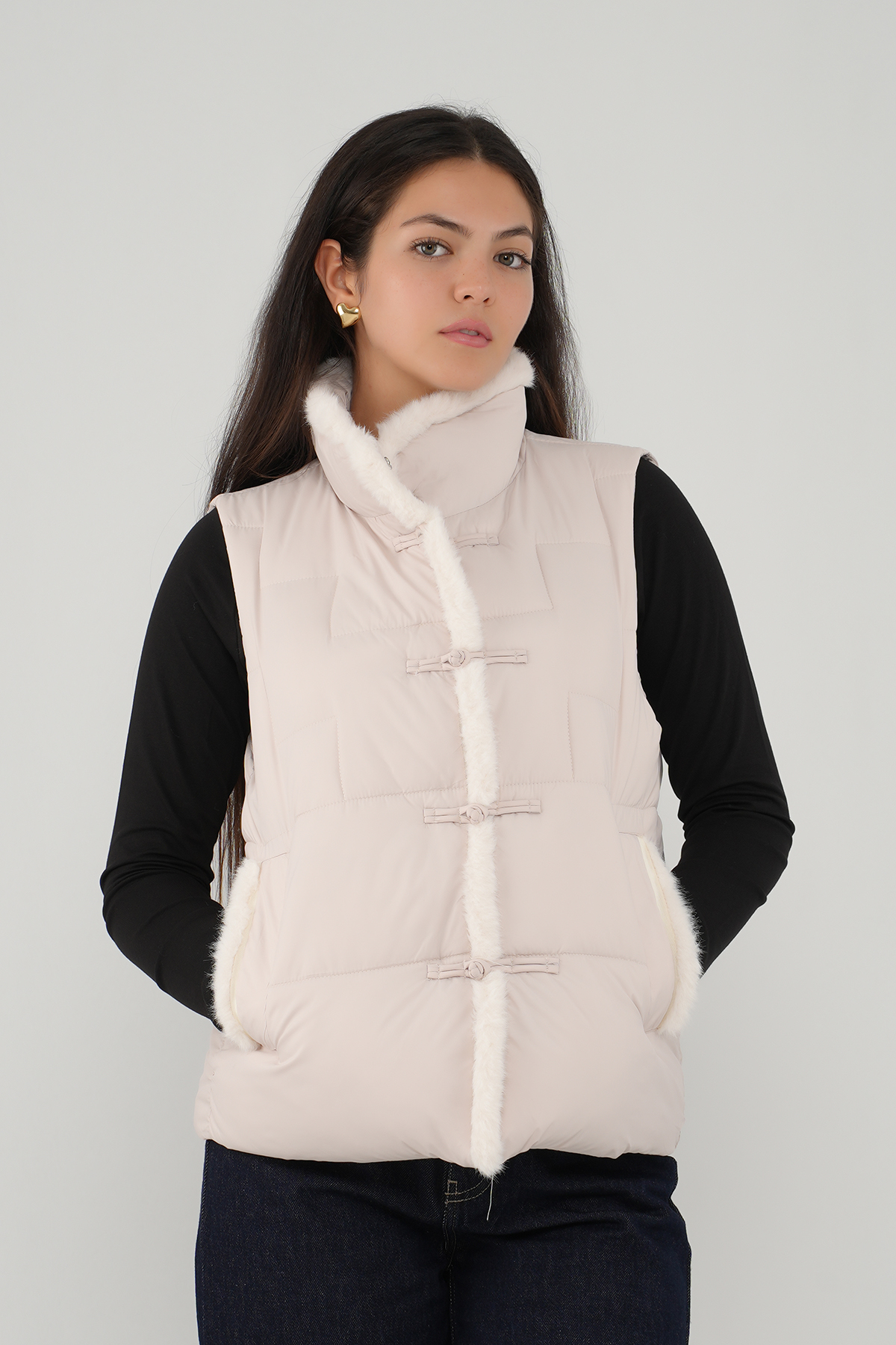 Apportez une touche de féminité et de confort à votre quotidien avec notre Doudoune sans manches avec détails fourrure.