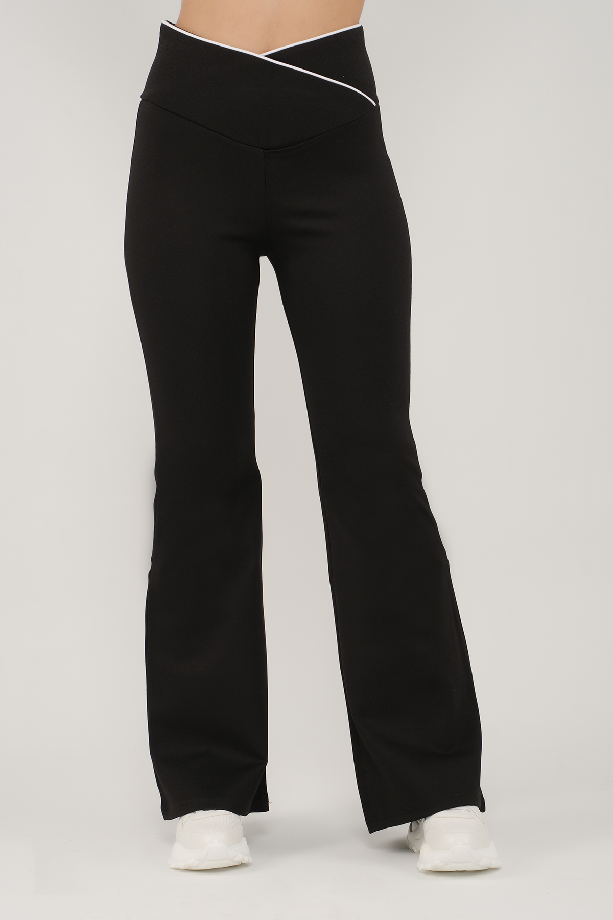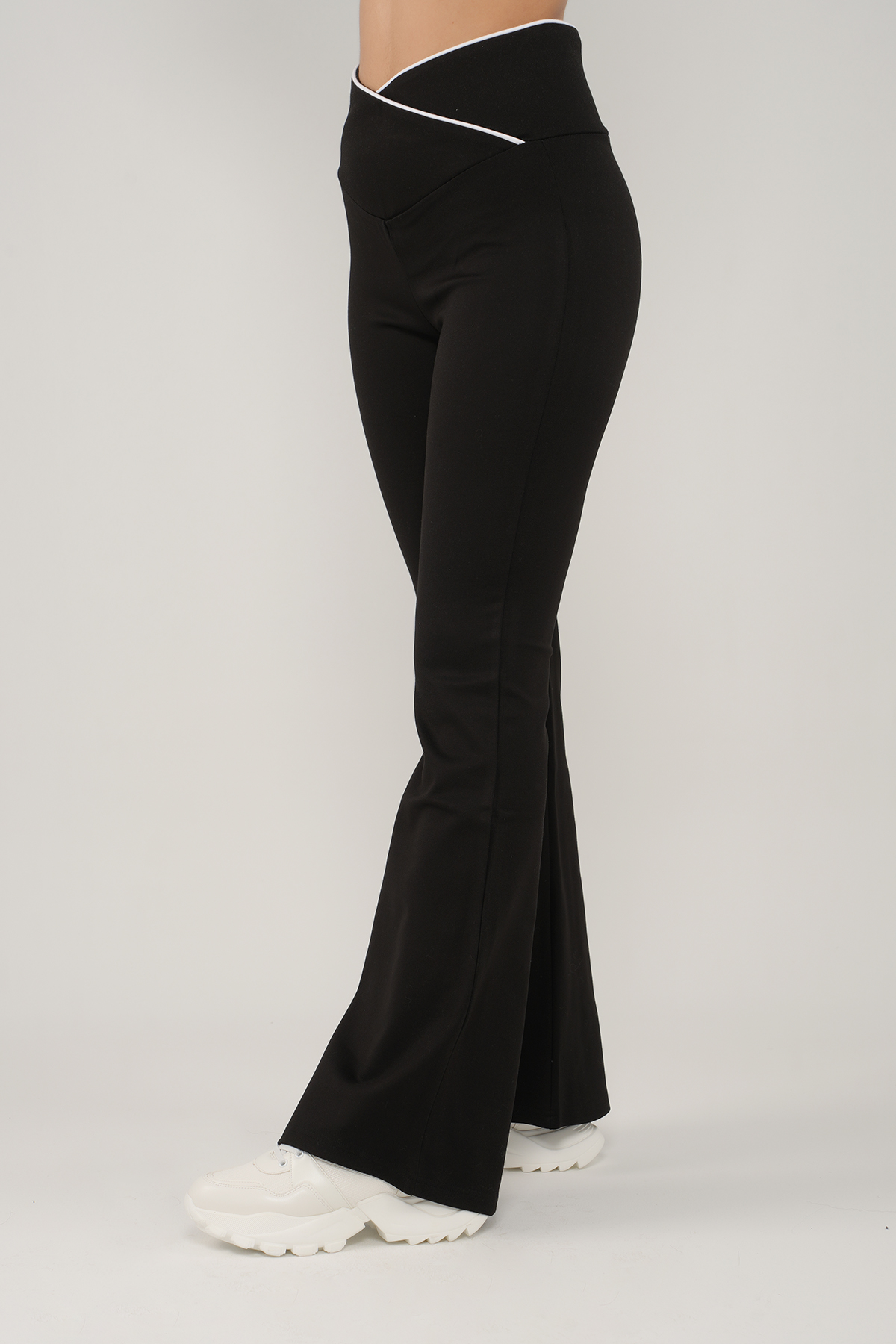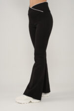 Ce legging noir séduit par sa coupe flatteuse et son design tendance. Sa taille croisée met en valeur la silhouette tout en apportant une touche d’originalité, soulignée par un fin liseré blanc contrastant. Conçu dans un tissu extensible et respirant, il offre un confort optimal pour vos journées actives. Sa coupe évasée à partir du genou allonge la jambe et crée une allure élégante et dynamique.