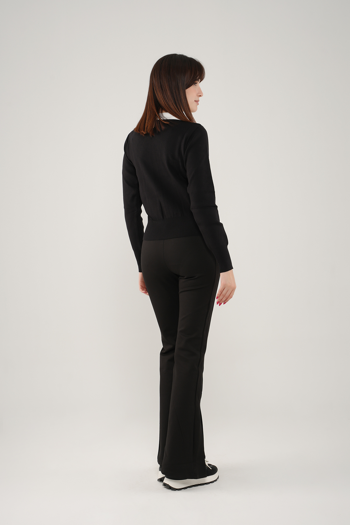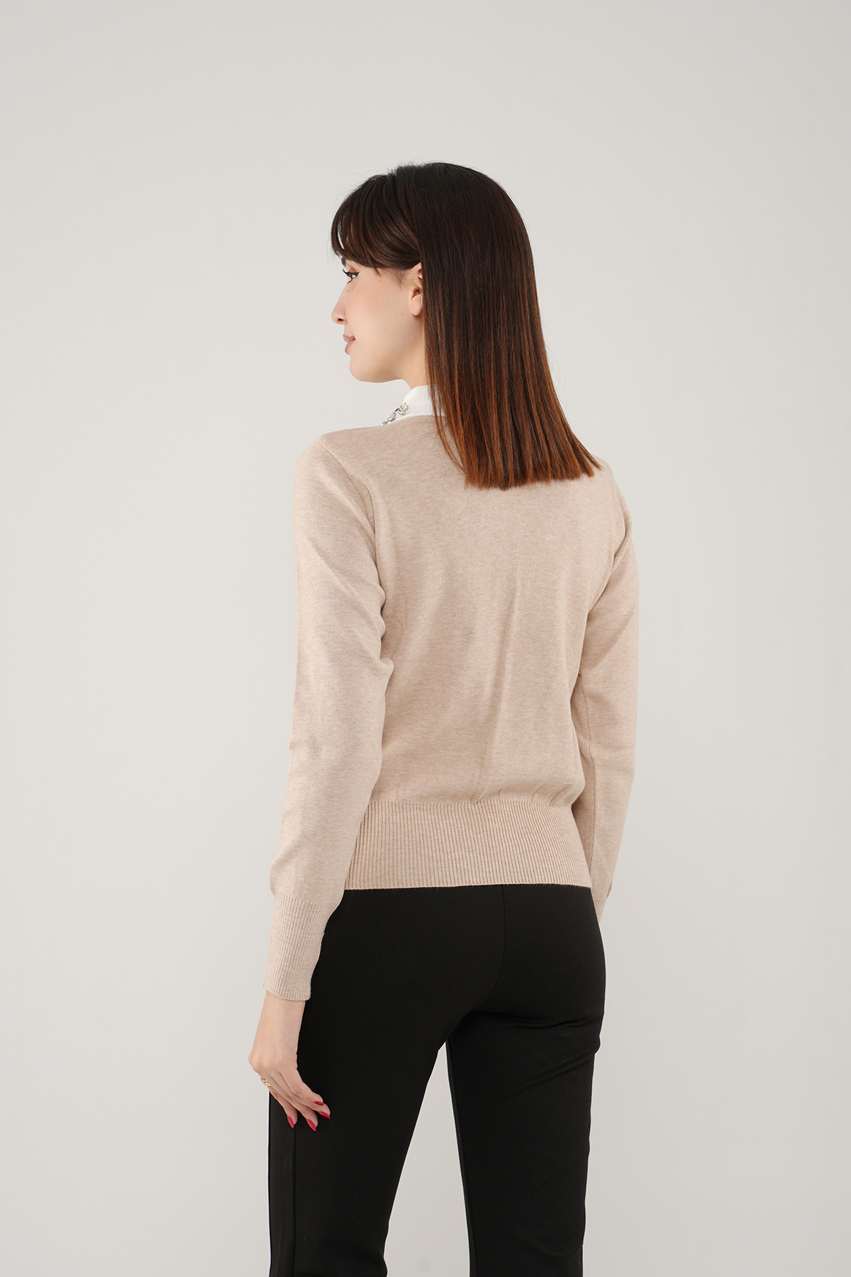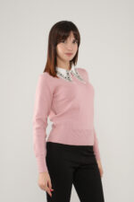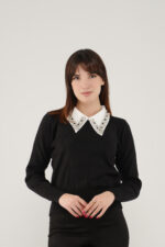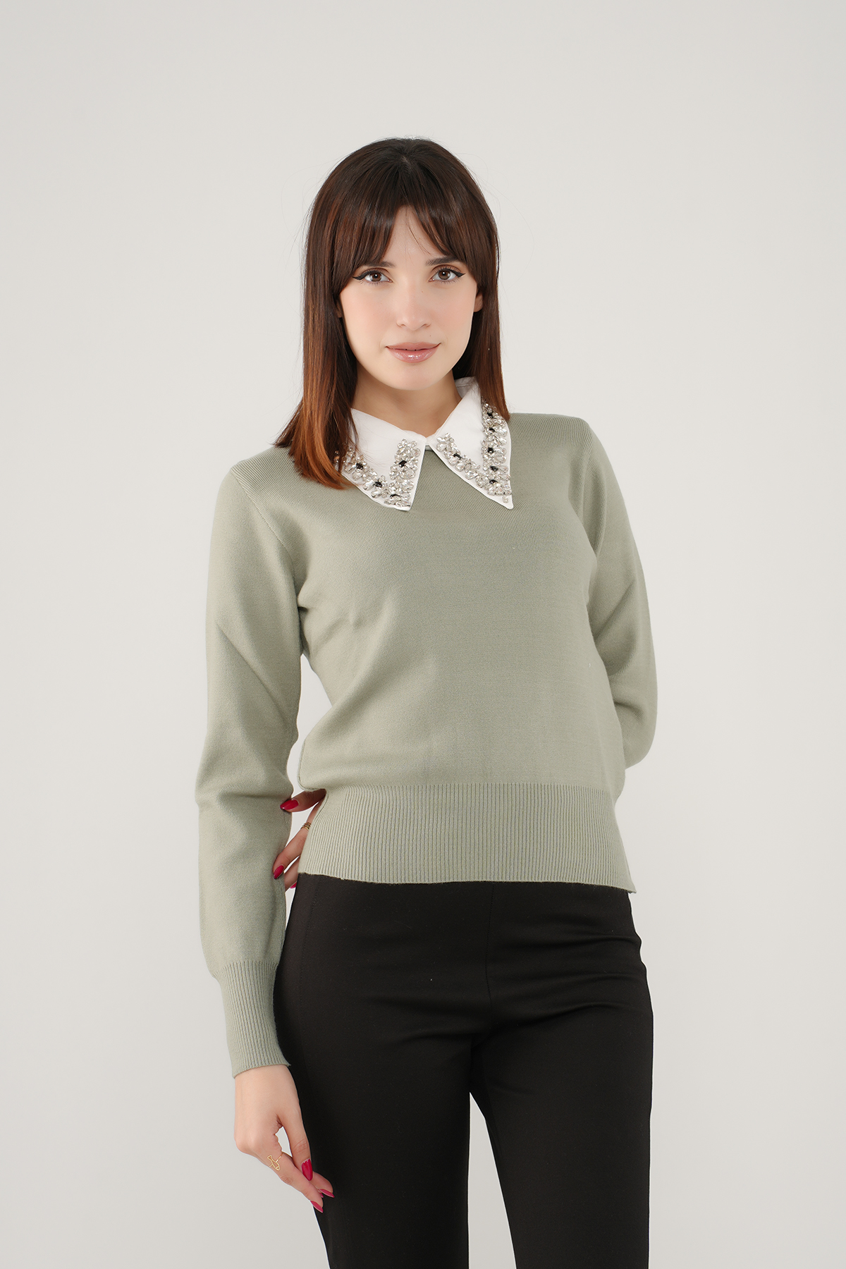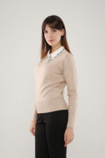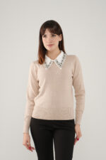 Apportez une touche d’élégance à votre tenue avec ce pull doux et féminin. Confectionné avec un tissu en lin, il se distingue par son col chemise blanc décoré de strass et de perles scintillantes pour un effet chic et raffiné.
