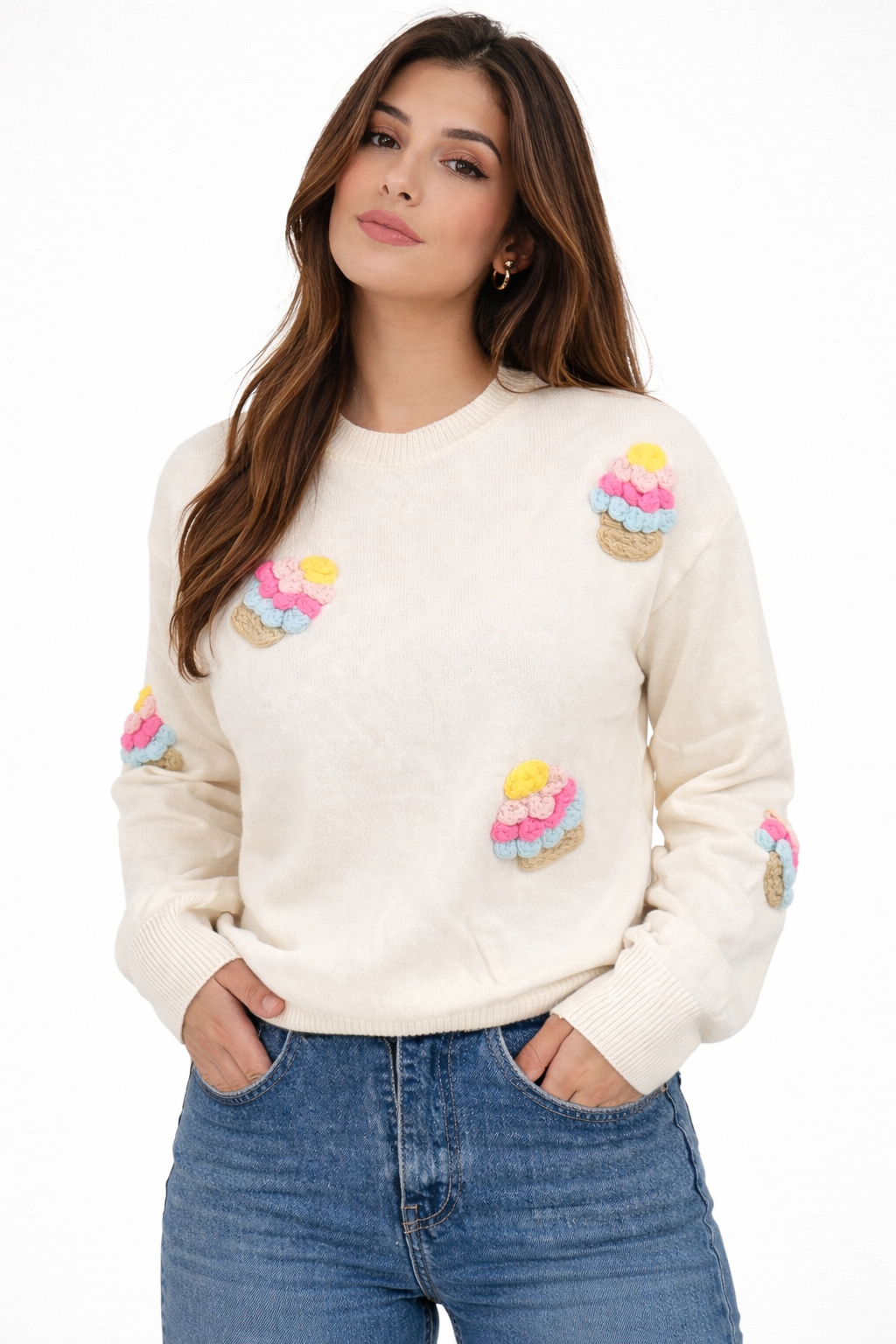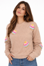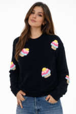 Apportez une touche de douceur et d’originalité à votre dressing avec ce pull en maille orné de motifs Ice Cream colorés. À la fois confortable et tendance, il se distingue par ses détails brodés en relief qui ajoutent du volume et un style unique à votre tenue.