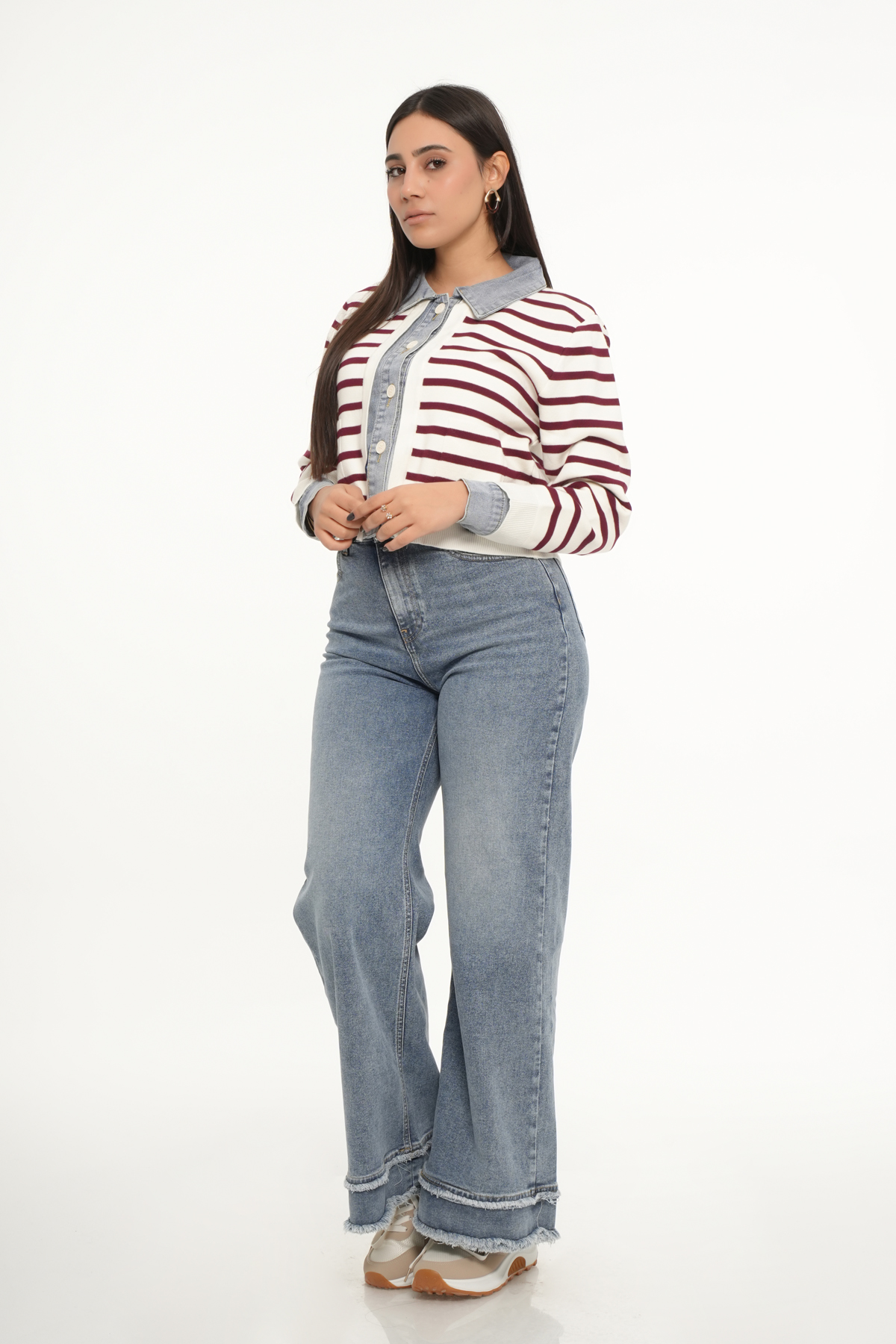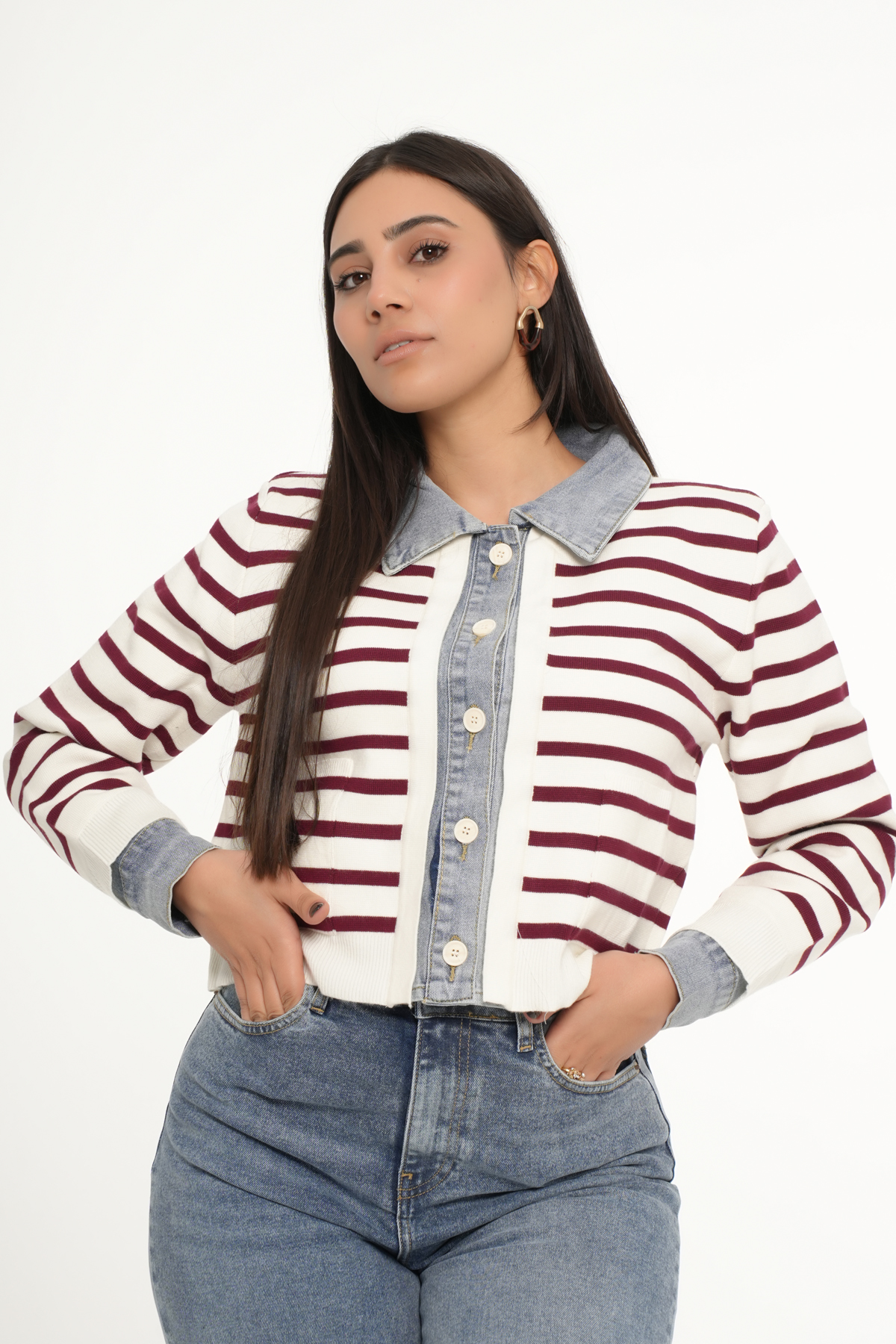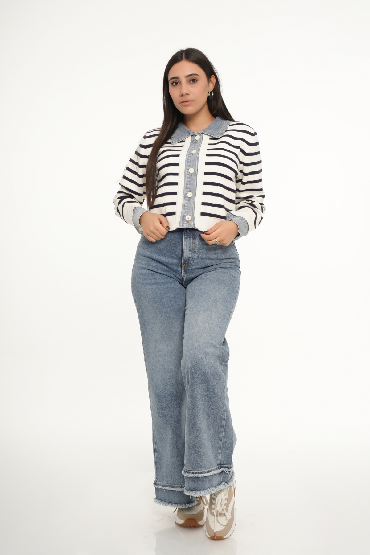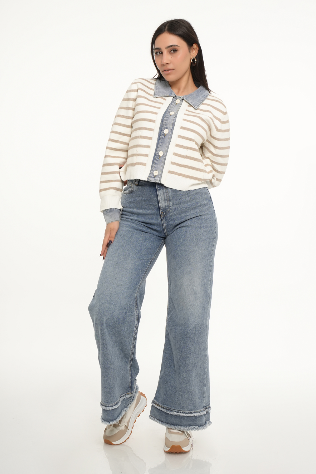 •  Le haut en maille met en valeur col et patte de boutonnage en denim, apportant une touche originale.