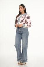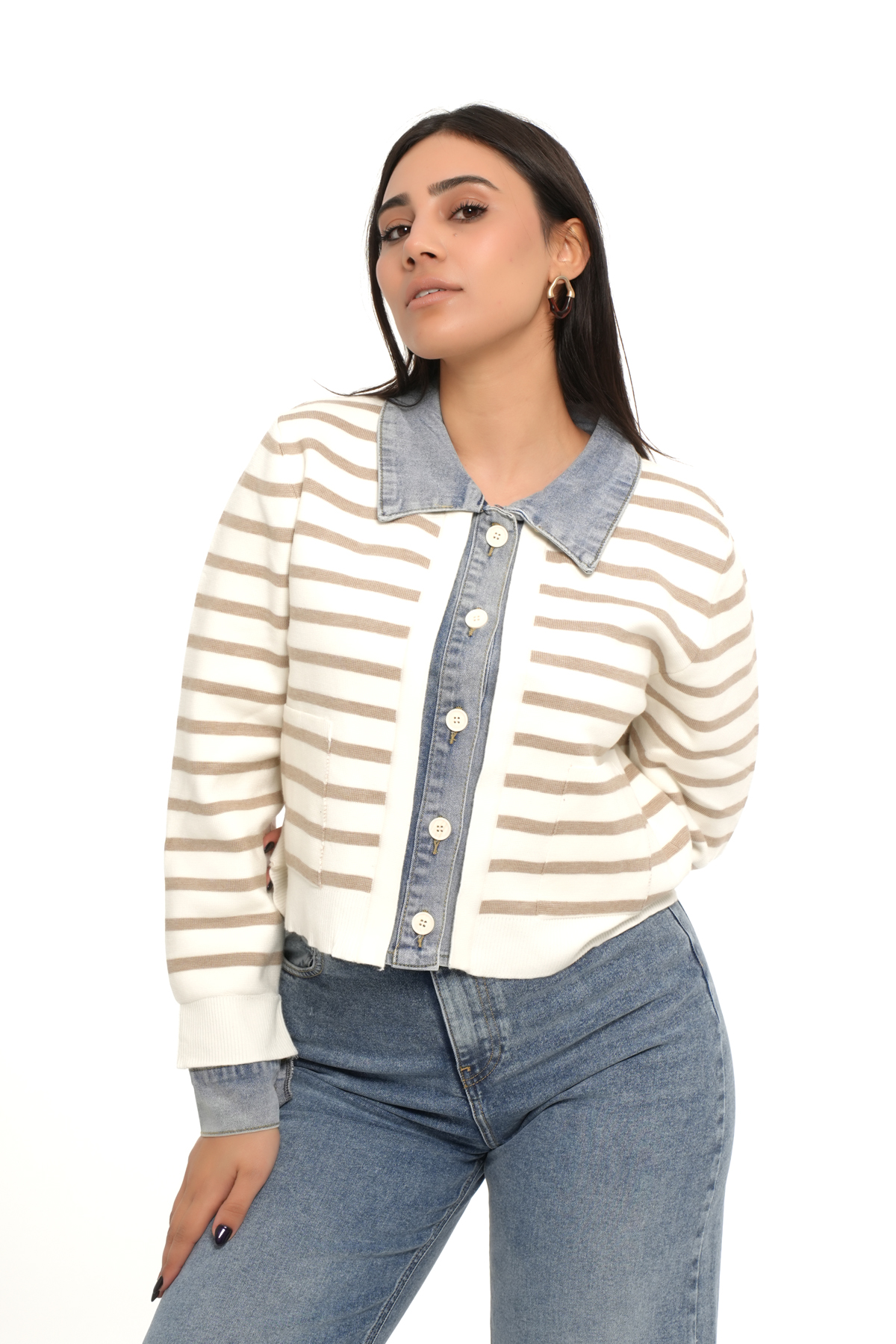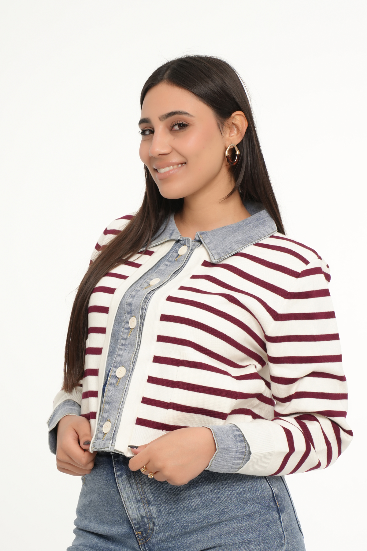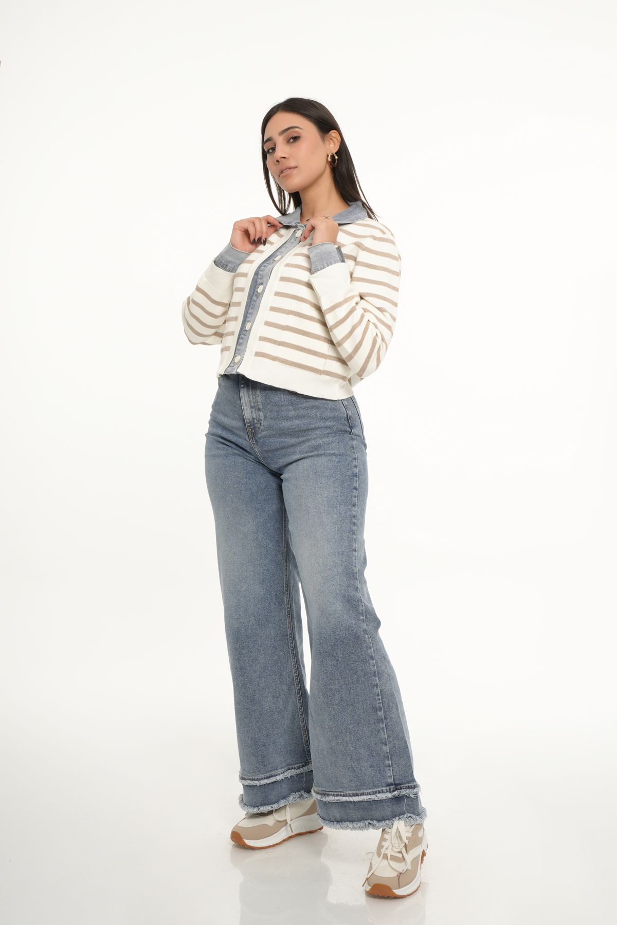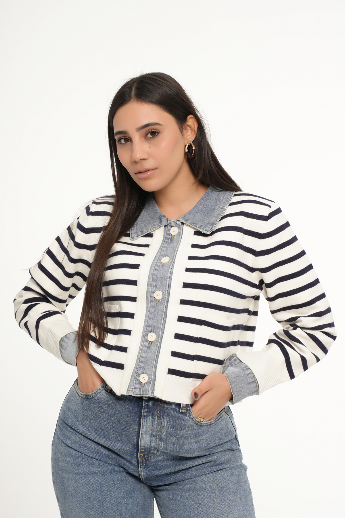 •  Le haut en maille met en valeur col et patte de boutonnage en denim, apportant une touche originale.