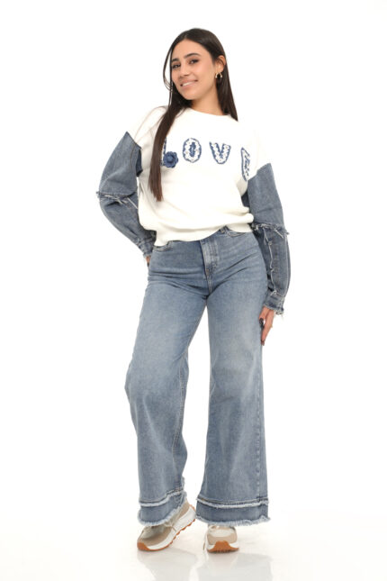 •  Les manches longues en denim créent un contraste moderne et audacieux.