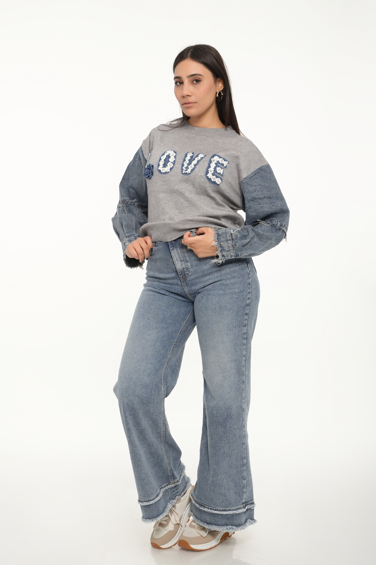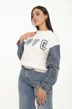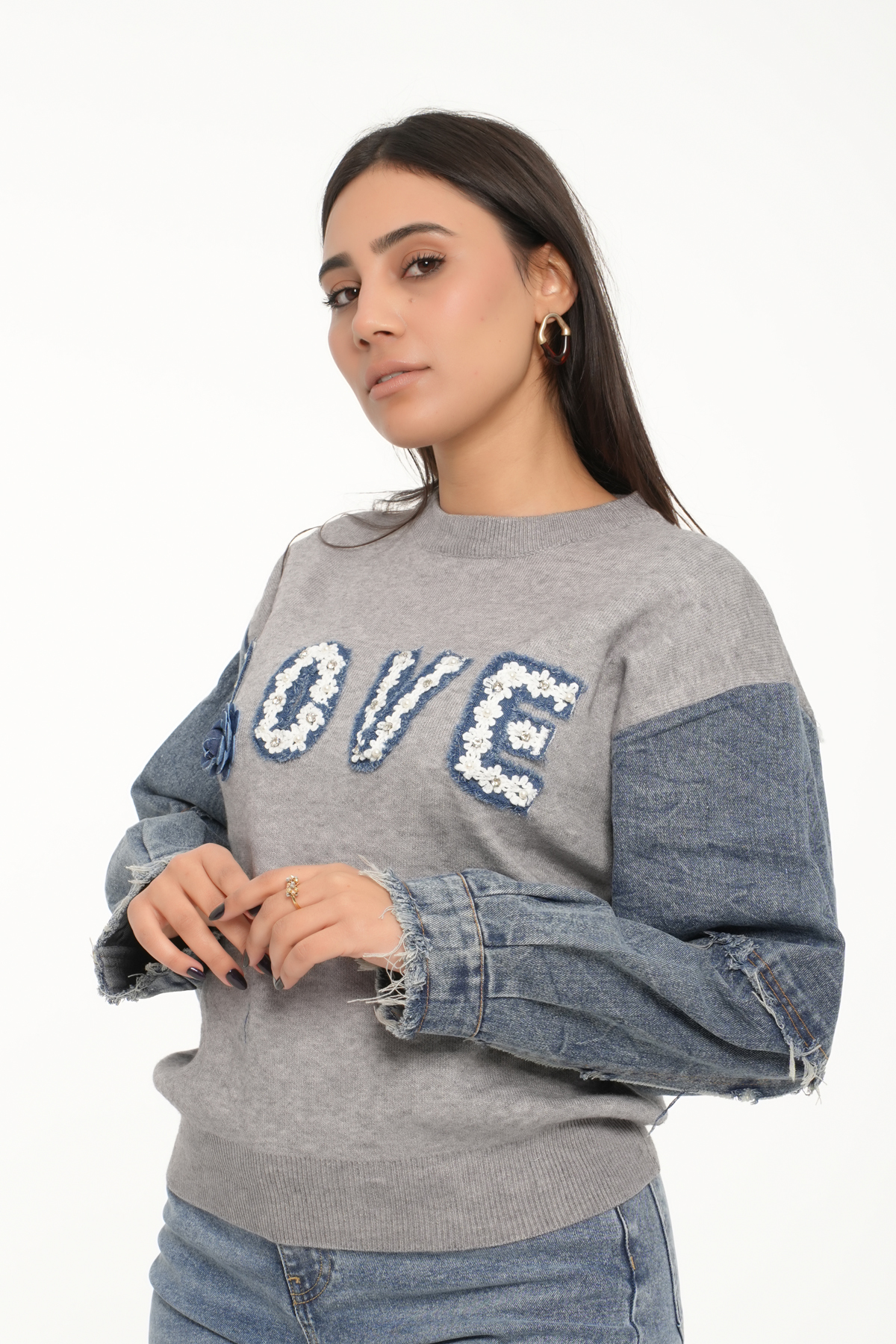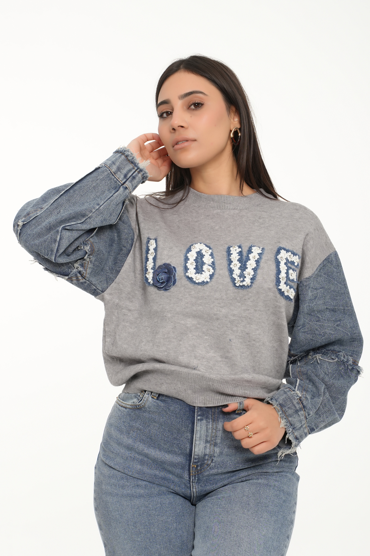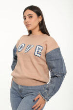 Le haut en maille met en valeur une broderie texturée “LOVE” ornée d’une fleur en denim, apportant une touche originale.