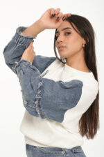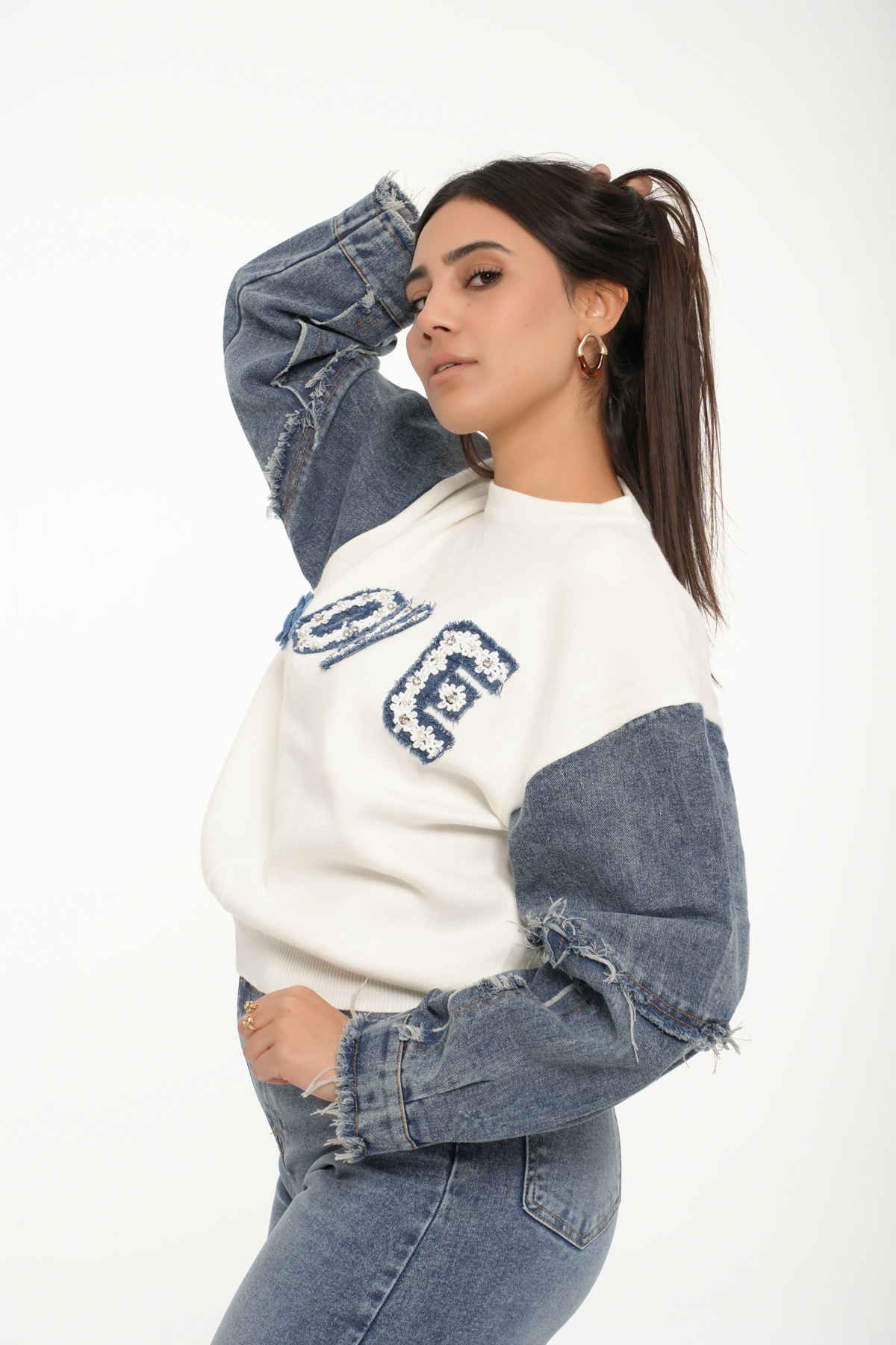 Les manches longues en denim, volontairement effilochées créent un contraste moderne et audacieux.