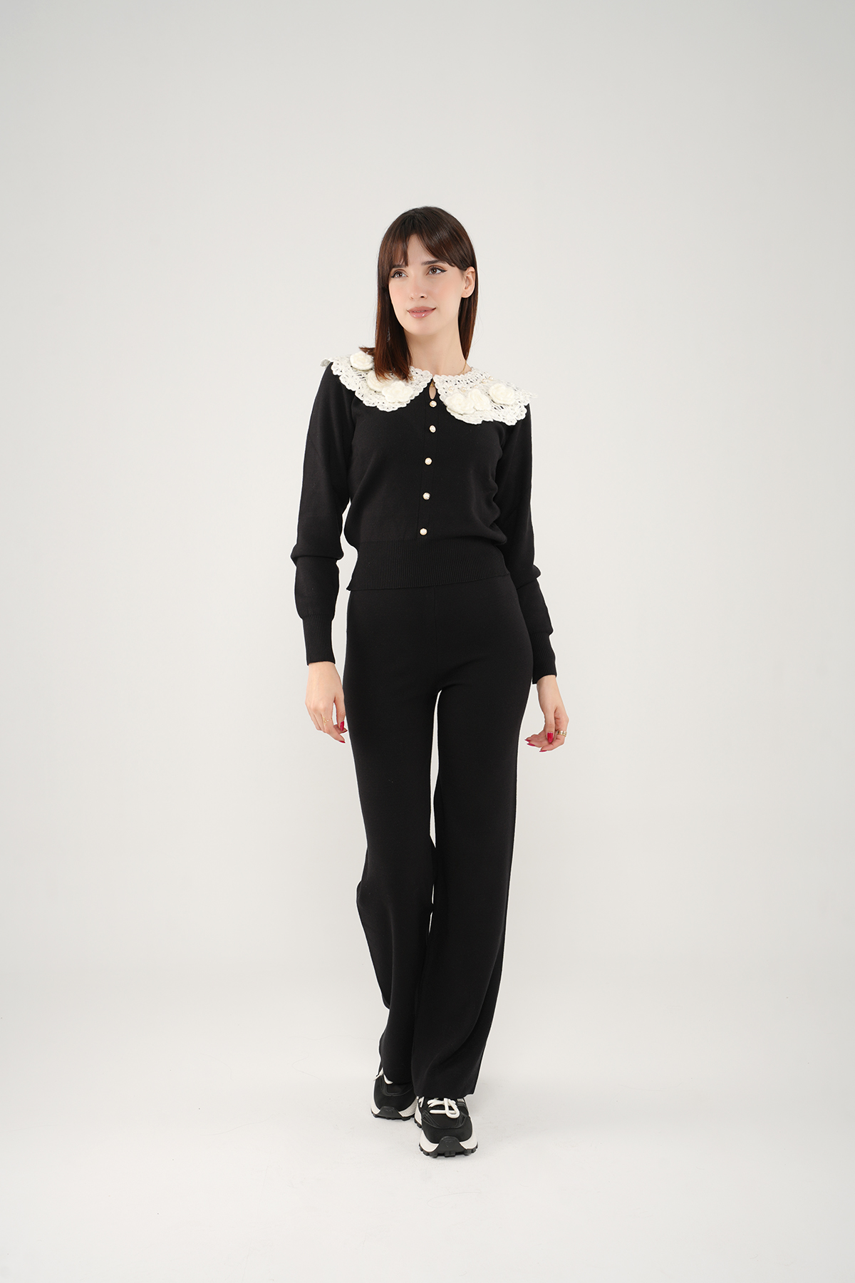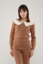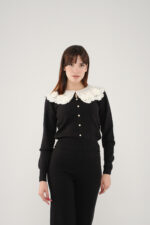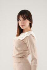 • Le haut à manches longues est sublimé par un col en dentelle, tandis que les boutons dorés à l’avant ajoutent une note raffinée et féminine.
