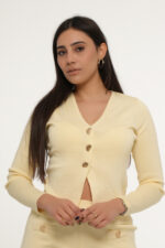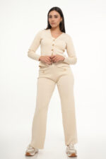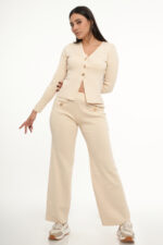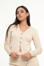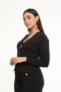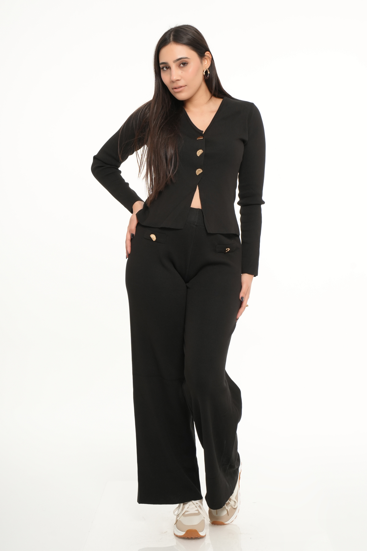 • Le haut présente une coupe ajustée avec un décolleté en V et des boutons décoratifs aux tons naturels, apportant une touche raffinée.