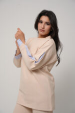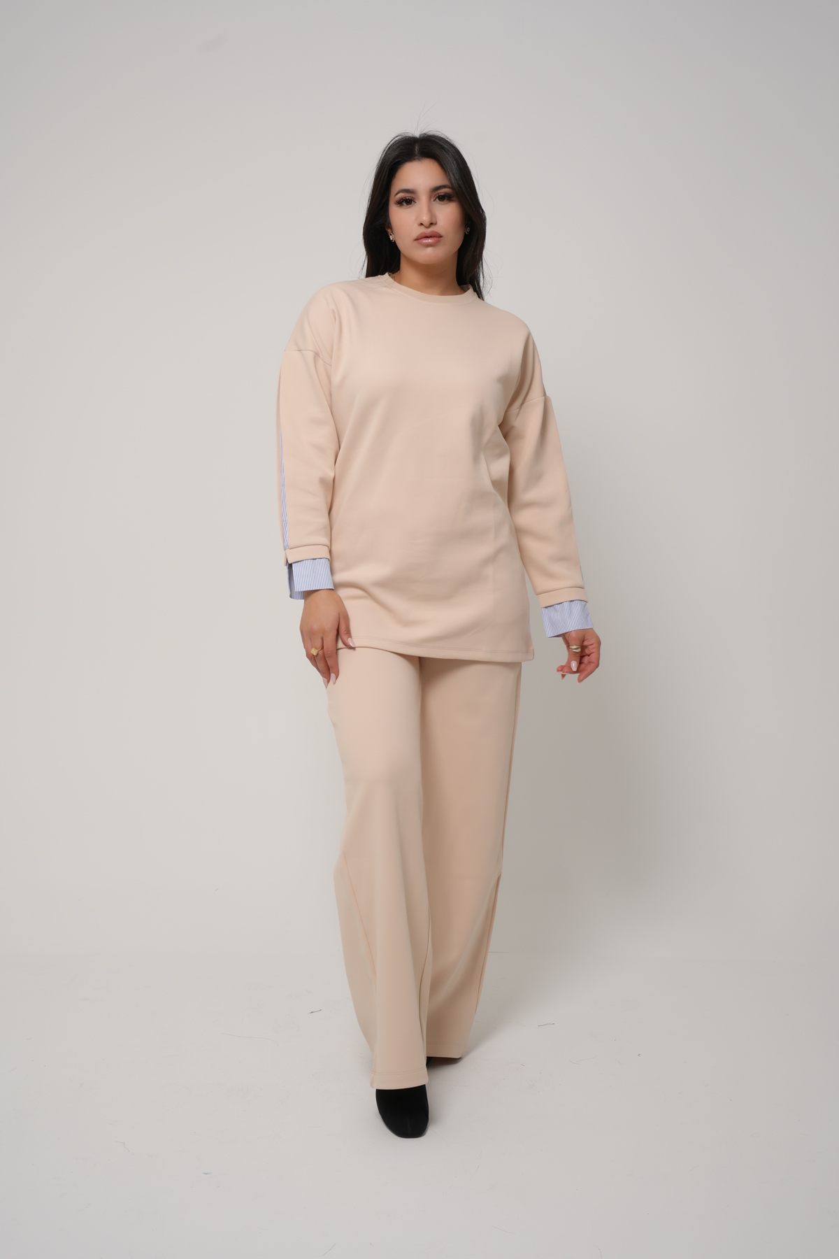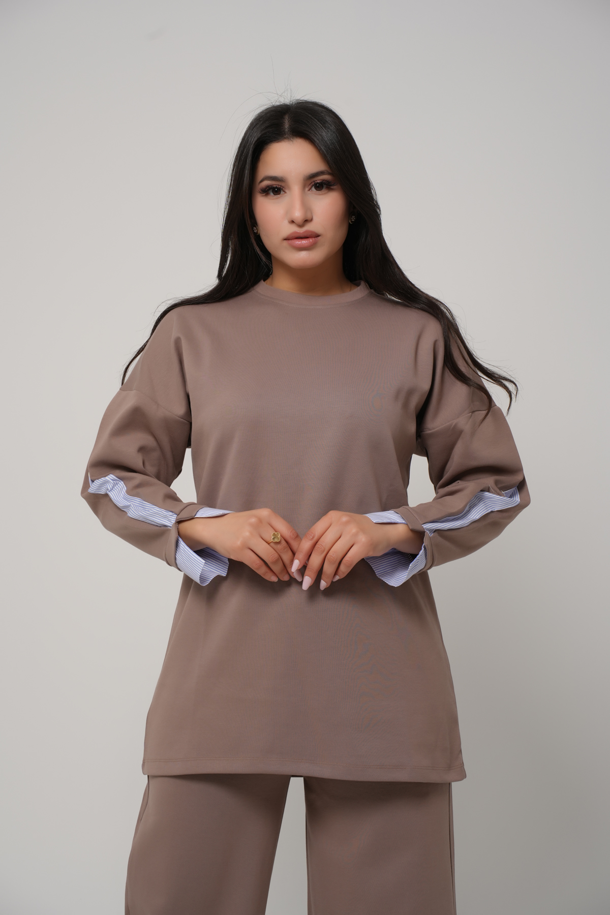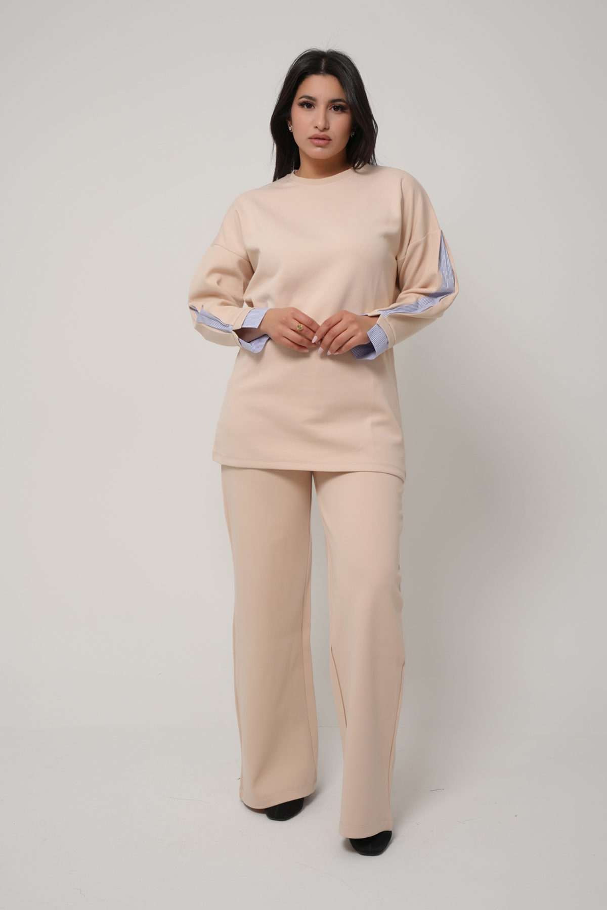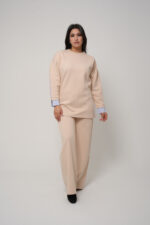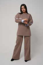 Optez pour une allure chic et moderne avec cet ensemble deux pièces au design épuré. Il se compose d’un haut long à col rond et manches longues, rehaussé de délicats empiècements contrastés au niveau des poignets et des manches pour une touche d’originalité subtile. Le pantalon assorti, à la coupe droite et fluide, assure une silhouette élégante et confortable.