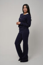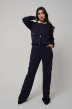Cet ensemble deux pièces incarne l’élégance moderne avec une touche de sophistication. Composé d’une veste structurée à boutons dorés et d’un pantalon droit assorti, il offre une silhouette harmonieuse et flatteuse. Sa teinte bleu marine intemporelle en fait une pièce chic et polyvalente, idéale aussi bien pour le quotidien.